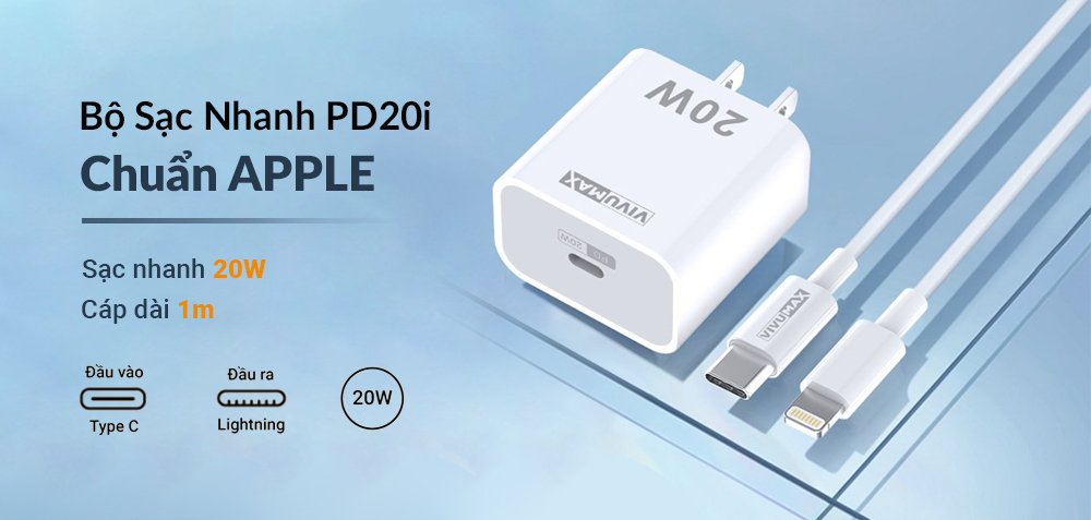 Bộ sạc cao cấp Vivumax PD20i 20W kèm cáp Type C to Lightning chuẩn Apple – Màu trắng