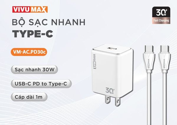 Bộ sạc nhanh cao cấp Vivumax PD30c 30W kèm cáp Type C to Type C 66W