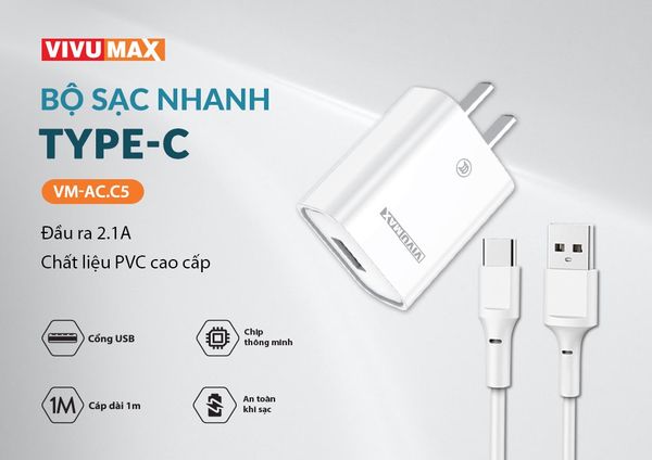 Bộ sạc Vivumax C5 kèm cáp Type C tương thích hầu hết các thiết bị như (Samsung/Oppo/Nokia/Xiaomi/Vsmart/Realme) – Hàng Chính Hãng, Bảo Hành 12 Tháng (Đổi Mới)