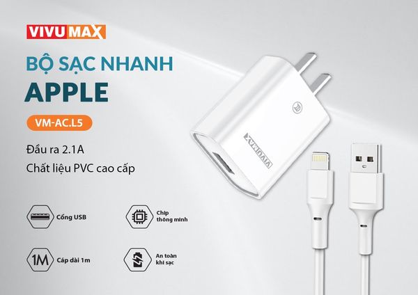 Bộ sạc Vivumax L5 kèm cáp Lightning tương thích hầu hết các thiết bị của Apple – Hàng Chính Hãng, Bảo Hành 12 Tháng (Đổi Mới)