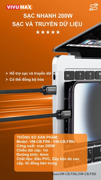 Thông số kỹ thuật Cáp dù sạc nhanh 200W 6A Vivumax F99c Type-C