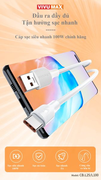 Hãy tận hưởng sạc siêu nhanh 100W, 5A và an toàn của cáp sạc nhanh 5A Vivumax L25c đầu Type C dài 25cm