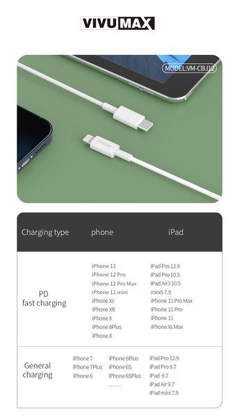 Cáp sạc nhanh và truyền dữ liệu chuẩn Apple Vivumax I12 (Type C to Lightning)– Hàng Chính Hãng, Bảo hành 12 Tháng (Đổi Mới)