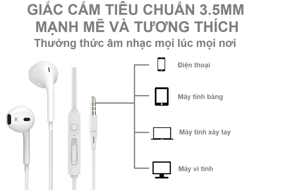 Tai nghe có dây VivuMax HE.J15 dài 1.2 m, cùng giắc cắm 3.5mm tương thích với hầu hết các thiết bị như điện thoại, máy tính bảng, laptop, máy vi tính…